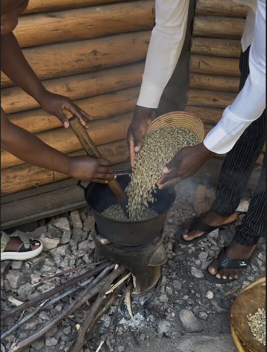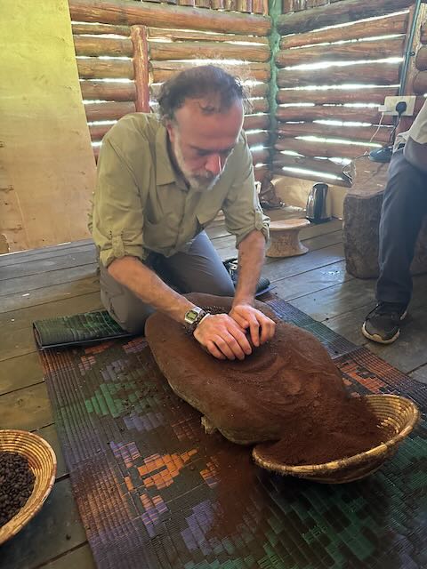 Vroeger werden de koffiebonen in een holle boomstammen geplet met een dikke stok en werd zo het omhulsel verwijderd. Vervolgens schudden ze dit in een rieten mandje en bliezen ze het residue weg zodat enkel de bonen overbleven. Dit ging in de kookpot waarbij iemand 30 (light roast) tot 45 (dark roast) minuten constant moest roeren terwijl de 2e persoon het vuur reguleerde. De gebrande bonen werden op een grote steen gelegd en fijn gemalen door met de de kleine steen over en weer te gaan. Het verbaasde me hoe fijn je dit kon krijgen, zelfs een espresso grind was doenbaar. Het geheel ging in de tas, warm water erover en de koffie was klaar. Toch best veel werk dat bij een kopje koffie kwam kijken…
